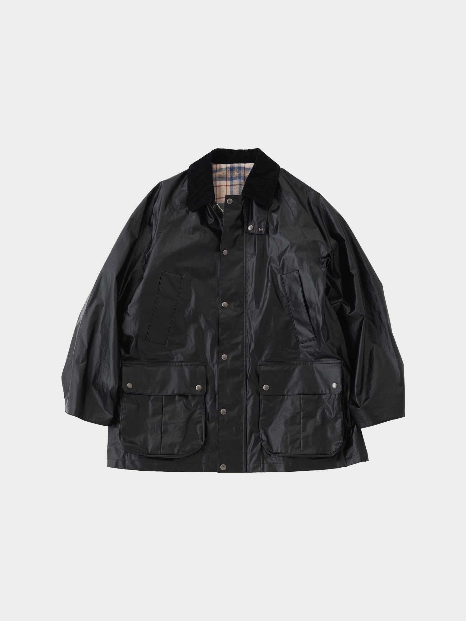 Incorporating classic hunting jacket elements—such as the front pocket design and checked lining—this piece is finished with an oversized silhouette.