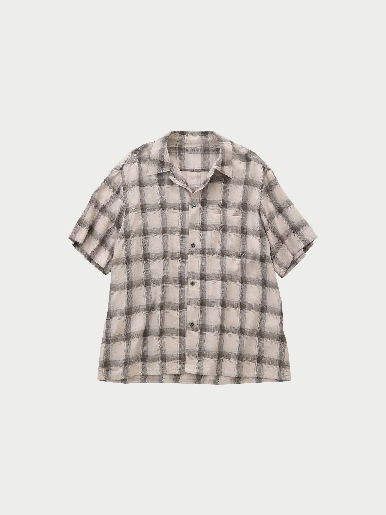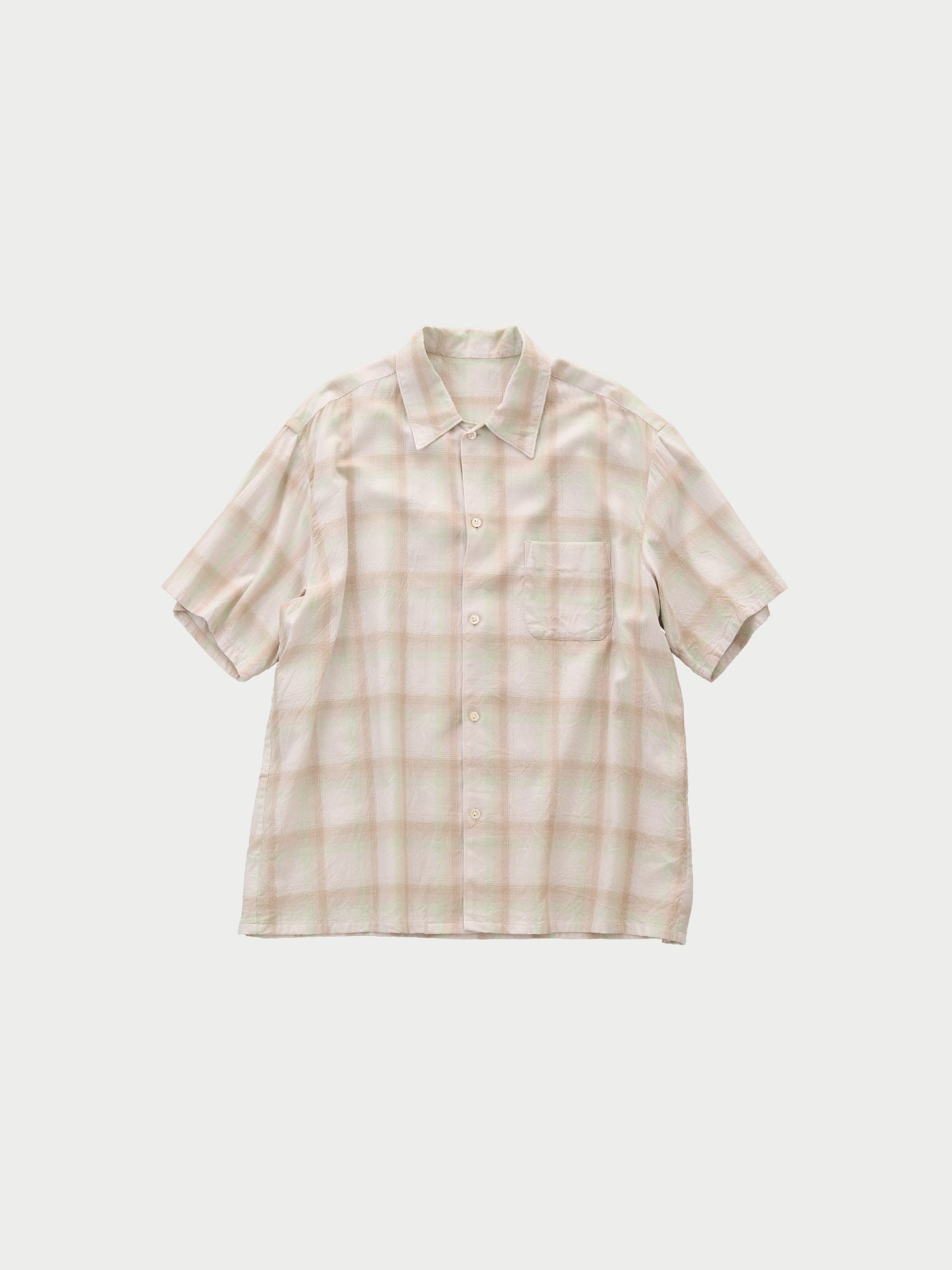 A short-sleeve open-collar shirt made from a cotton-rayon blend.